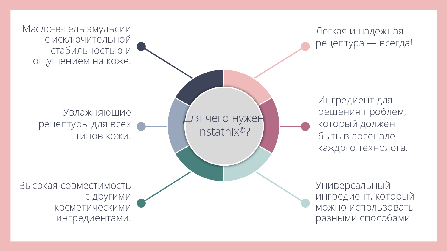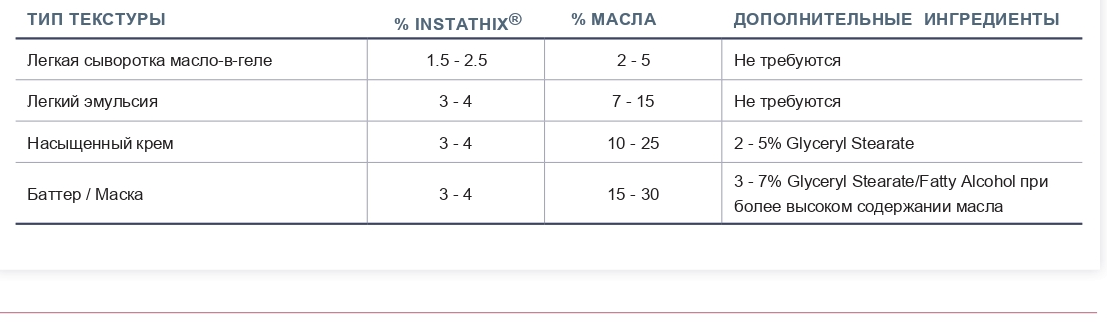 Instathix® представляет собой концентрированную порошковую смесь натуральных эмульгаторов, стабилизаторов и модификаторов текстуры, позволяющую легко получать стабильные эмульсий типа "масло-в-геле". С ним можно создавать как жидкие сыворотки с шелковистой гладкой текстурой, так и более насыщенные и густые кремы и баттеры. Кроме того, этот ингредиент можно использовать для решения проблем, связанных с повышением вязкости или улучшением стабильности и текстуры уже готовых рецептур.