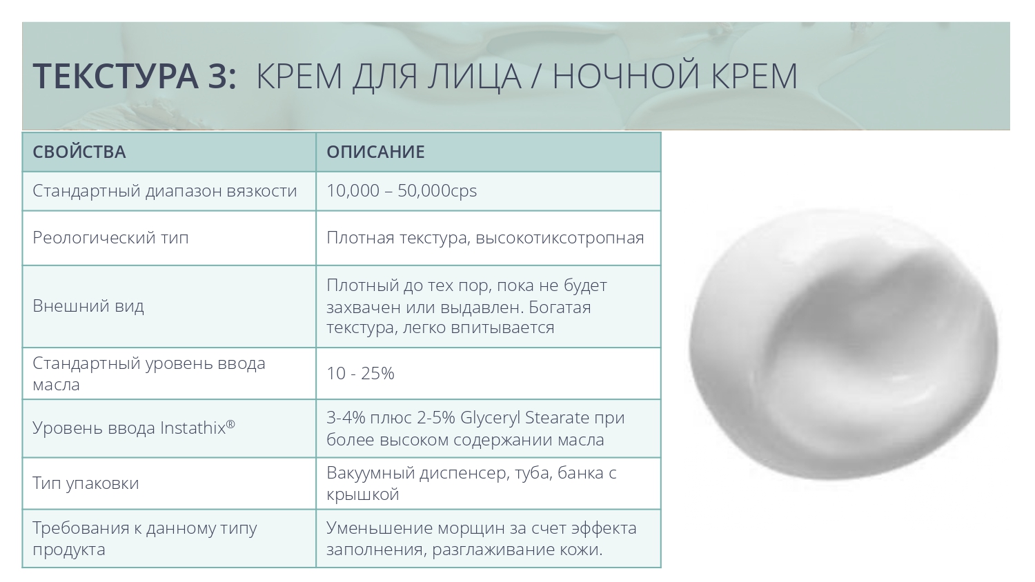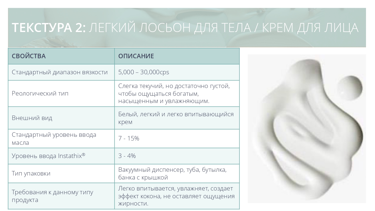 • Сатиновый матовый внешний вид, имитирующий ощущение силиконового эластомера – может заменить синтетические эмульгаторы / полимеры
